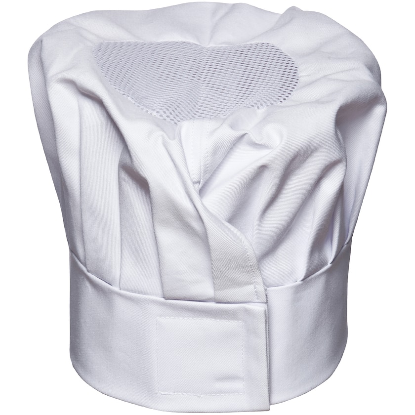 Klassisk kokkehatt. Størrelsen reguleres med en borrelås. Kokkehatten er laget av bomull, unntatt nettet som er av polyester.