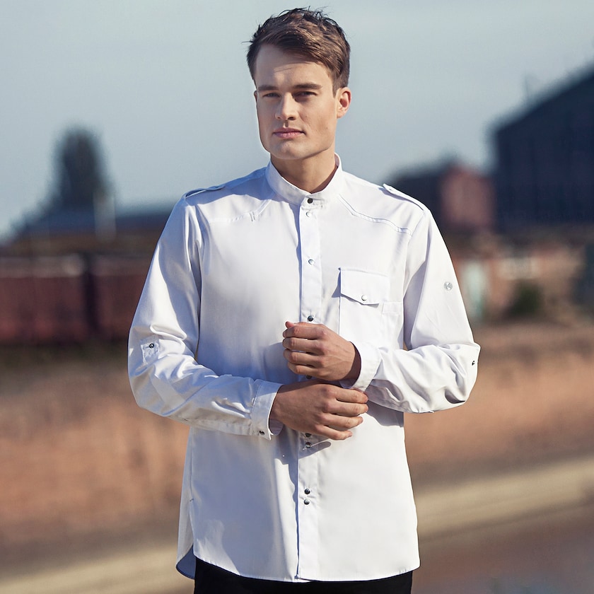 Moderne kokkeskjorte i stoff i høy kvalitet. Stoffet er av typen easy-care. Skjorten holdes lukket i 5 stk trykknapper. Tåler industrivask i opptil 95 grader.