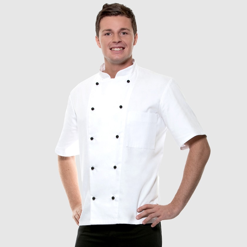 Kortermet Kokkejakke for herrer. Kokkejakken Lennert, lukkes med 10 kokkeknapper (ikke inkludert). Det er en brystlomme på venstre bryst. Kokkejakken tåler industrivask opp til 95 grader. Finnes også som damemodell.