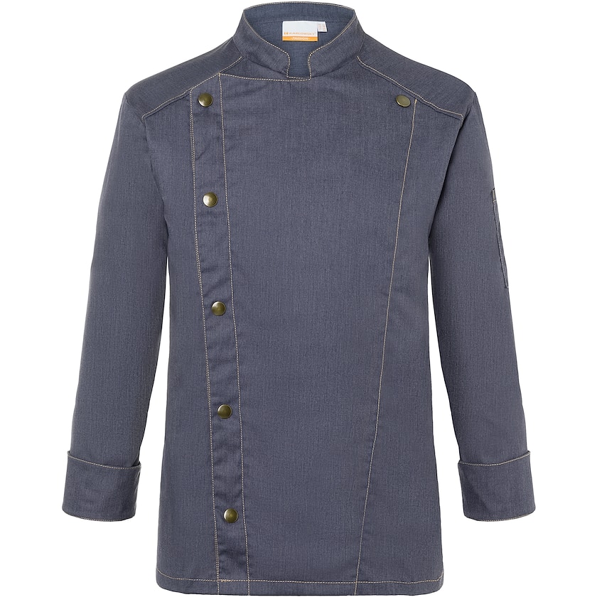 Moderne kokkejakke med jeans-lignende stoff. Stoffet holder meget høy kvalitet og er av typen easy-care. Kokkejakken har kroppsnære passform og sømmer i kontrastfarge. Jakken holdes lukket med 5 stk trykknapper. Tåler industrivask i opptil 95 grader.