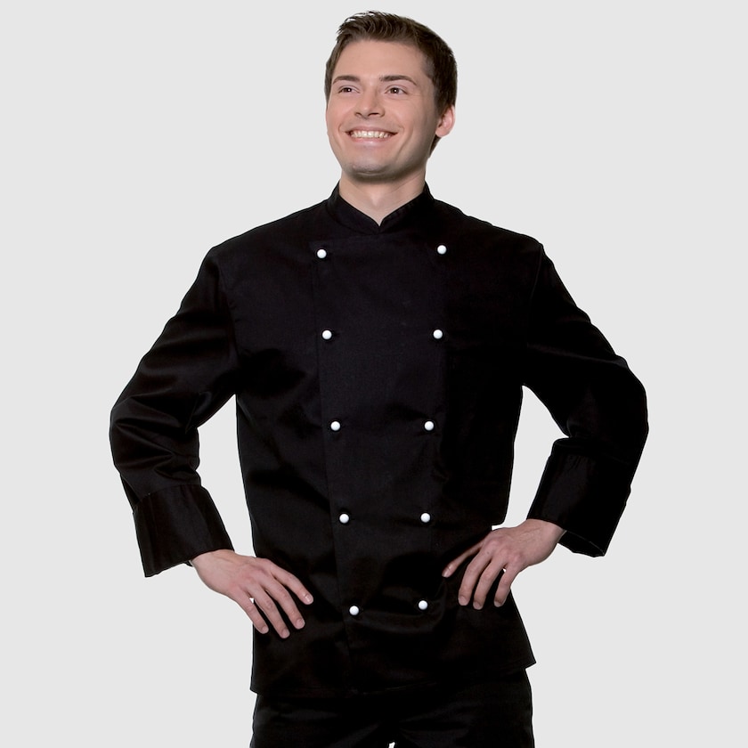 Klassisk kokkejakke til herre. Kokkejakken lukkes med 10 kokkeknapper (ikke inkludert). På venstre bryst er det en brystlomme. Jakken tåler industrivask i opptil 95 grader. Finnes også som damemodell.