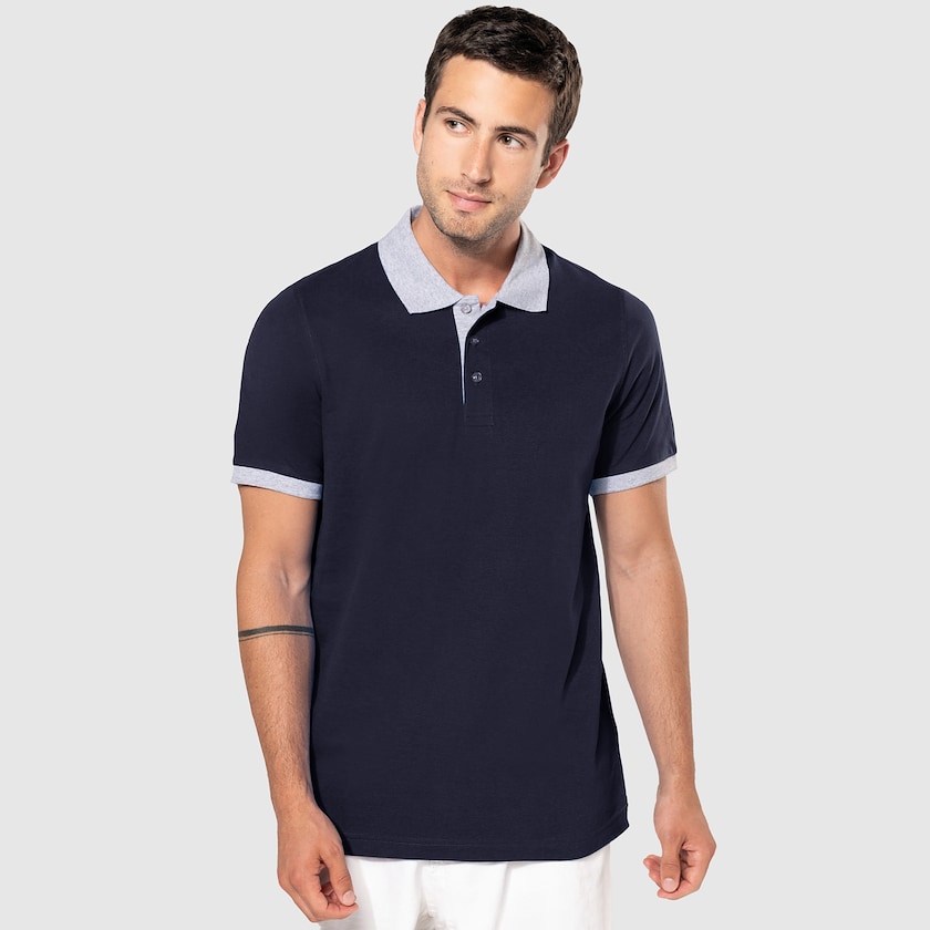 Pent designet pikétrøye med kontrastfarge på ermene og kragen. Poloen er laget av 100% bomull, foruten fargen oxford grey som inneholder 10% viskose. Leveres enkeltpakket i plastpose. Finnes også som damemodell.