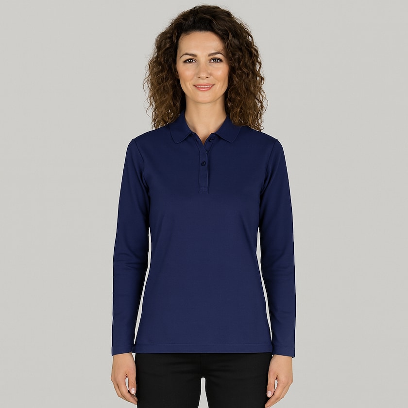Langermet polo til dame. Poloen er produsert i et kraftig bomullsstoff. Knappene i halsen matcher stoffet. Merking kan gjøres med trykk eller broderi. Finnes også som herremodell.