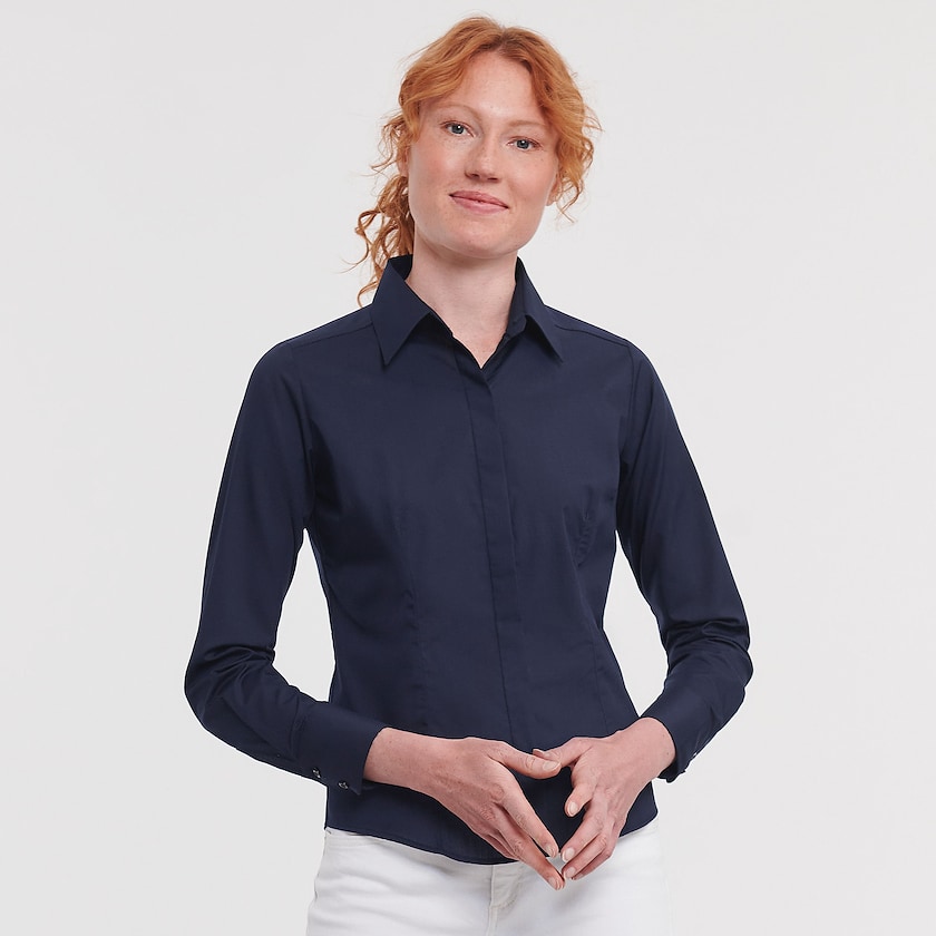 Langermet dameskjorte med stoff av typen easy care. Skjorten har en kroppsnær passform som gir den et moderne utseende. Knappene er skjulte. Leveres enkeltpakket i plastpose. Finnes også som herremodell.