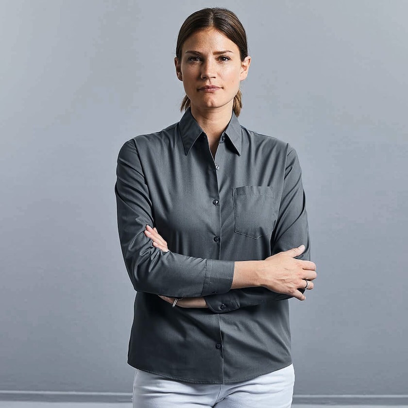 Langermet dameskjorte i slitesterk polyesterblanding for hardt bruk. Leveres pakket enkeltvis i plastposer.