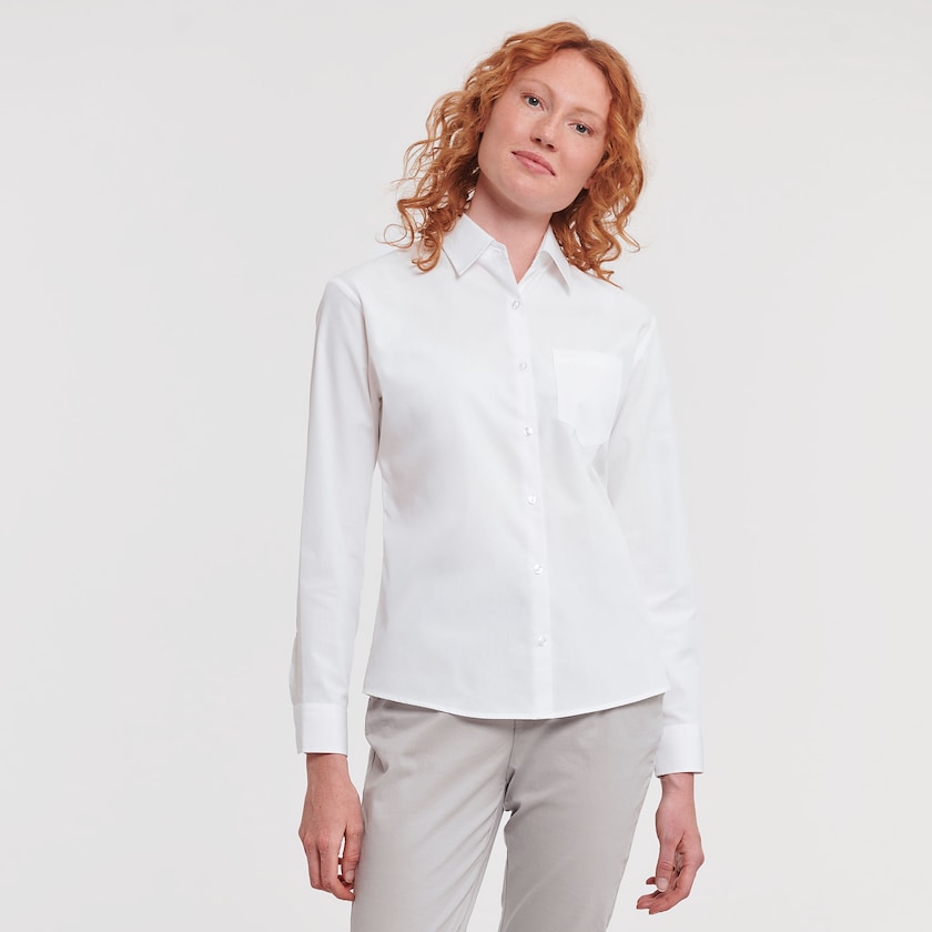 Langermet dameskjorte i 100% easy-care bomull. Leveres pakket enkeltvis i plastposer.