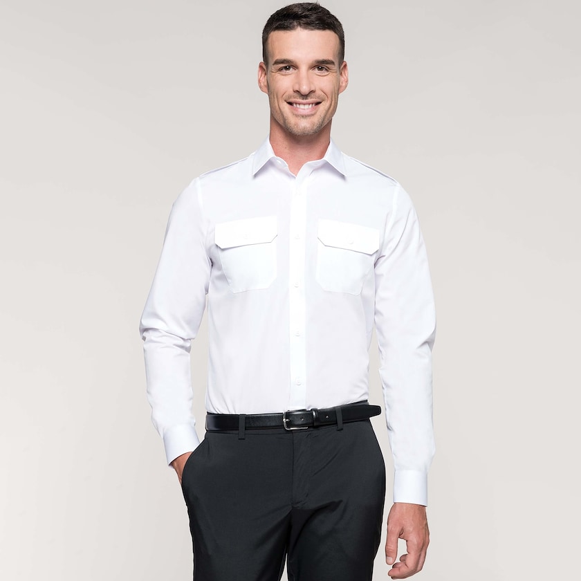 Langermet pilotskjorte for herrer. Skjorten har doble brystlommer og fester til skulderklaffer. Leveres enkeltpakket i plastpose. Finnes også som damemodell.