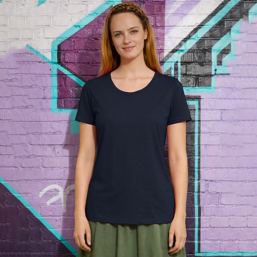 Figursydd t-skjorte for damer laget av 100% økologisk bomull. Trøyene har rent design og en feminin passform. De leveres pakket en og en i plastpose. Finnes også som herremodell.