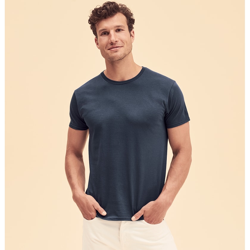 T-skjorte fra Fruit of the Loom med moderne passform. Finnes i et stort antall farger. Trøyen er laget av 100% bomull, bortsett fra fargen heather grey, som er laget av 97% bomull og 3% polyester, samt fargene med "retro", "vintage" eller "heather" i navnet, som er laget av 52% bomull og 48% polyester. Leveres stykkforpakket i plastpose. Finnes også som damemodell.