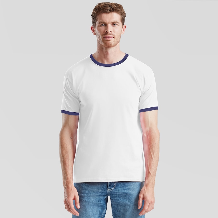 Fin og rimelig T-skjorte med hvit kontrastfarge på ermene og hals. Trøyene leveres individuelt pakket i plastpose.