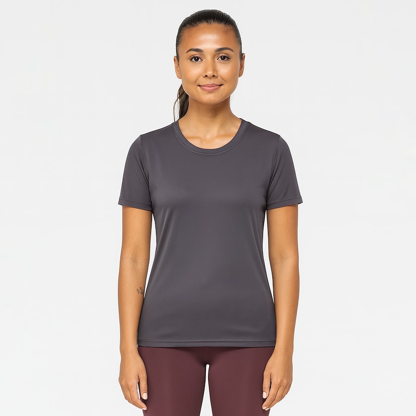 Trenings t-skjorte til dame av et polyesterstoff som holder deg kjølig. T-skjorten har rund hals og figursydd passform. Stoffet holder deg kjølig selv ved intensiv trening. Finnes også som herremodell.