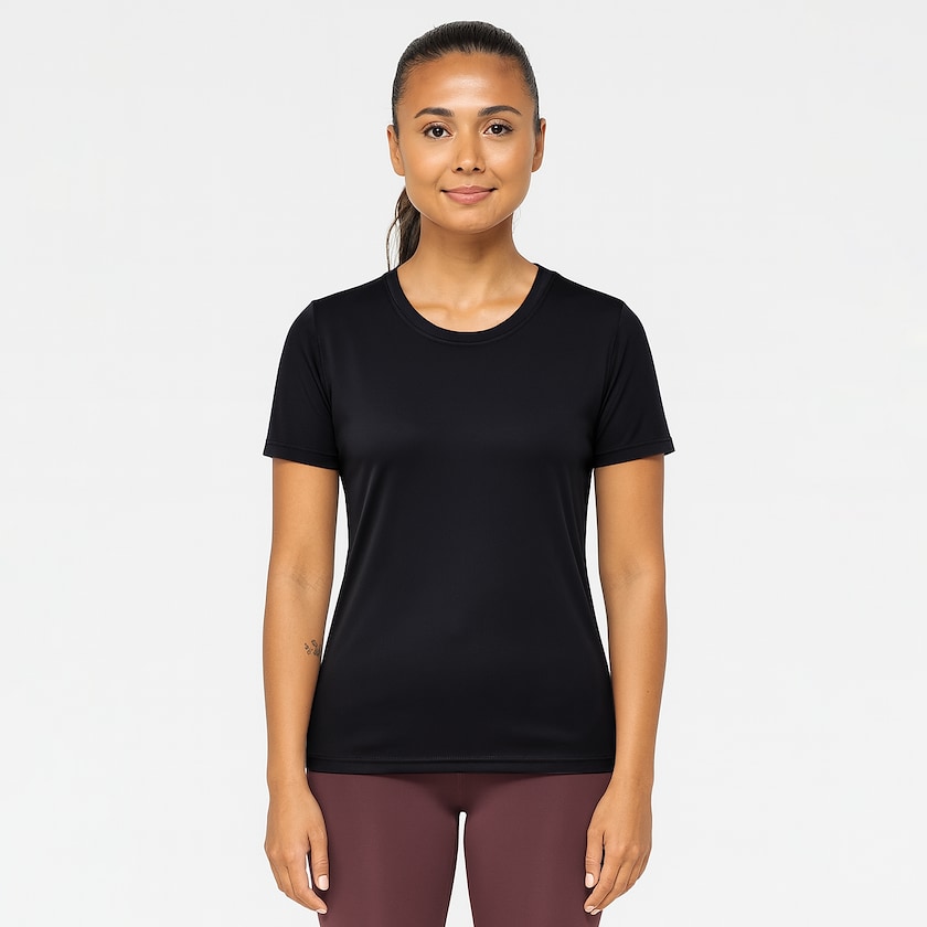 Trenings t-skjorte til dame av et polyesterstoff som holder deg kjølig. T-skjorten har rund hals og figursydd passform. Stoffet holder deg kjølig selv ved intensiv trening. Finnes også som herremodell.