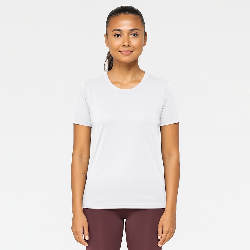Trenings t-skjorte til dame av et polyesterstoff som holder deg kjølig. T-skjorten har rund hals og figursydd passform. Stoffet holder deg kjølig selv ved intensiv trening. Finnes også som herremodell.