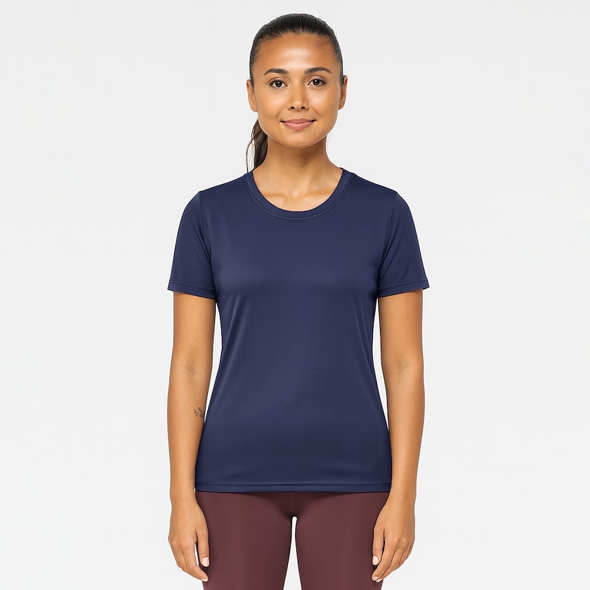 Trenings t-skjorte til dame av et polyesterstoff som holder deg kjølig. T-skjorten har rund hals og figursydd passform. Stoffet holder deg kjølig selv ved intensiv trening. Finnes også som herremodell.