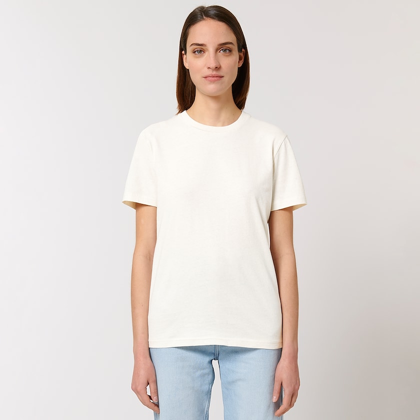 T-skjorte med trykk med stoff av resirkulert materiale. Stoffet i t-skjorten består av 50% resirkulert bomull og 50% økologisk bomull. Det resirkulerte materialet kommer fra Stanley & Stellas egen produksjon. Stoffet har en grovere struktur enn vanlig. Passformen er normal.