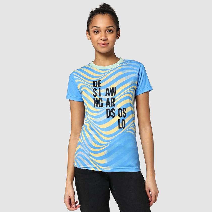 Spesialprodusert t-skjorte til dame i polyester med bomullsfølelse. T-skjorten er laget av et hvitt 145 grams polyesterstoff. Hele stoffet digitaltrykkes etter dine instruksjoner og sys etterpå sammen til en t-skjorte. Det gjør at det er mulig å ha et ubegrenset antall trykk og trykkfarger og trykk som går helt ut til sømmene. Finnes i størrelsene XS til 4XL. Minsteantallet per størrelse er 5 stk. Størrelsestoleransen er +/- 1,5 cm og vi reserverer oss for at levert antall kan avvike +/- 5%. Levert antall faktureres. Ettersom t-skjorten spesialproduseres, er leveringstiden lenger enn vanlig. Finnes også som herremodell.