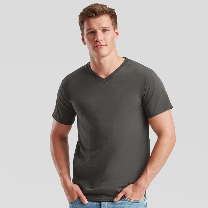 Rimelig V-utringet t-skjorte fra Fruit of the Loom. T-skjortene leveres enkeltpakket i plastpose. Finnes også som damemodell.