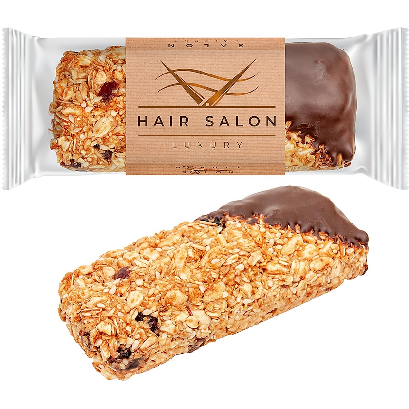 Müslibar delvis dyppet i sjokolade. Leveres i en transparent forpakning med en papphylse med eget trykk.