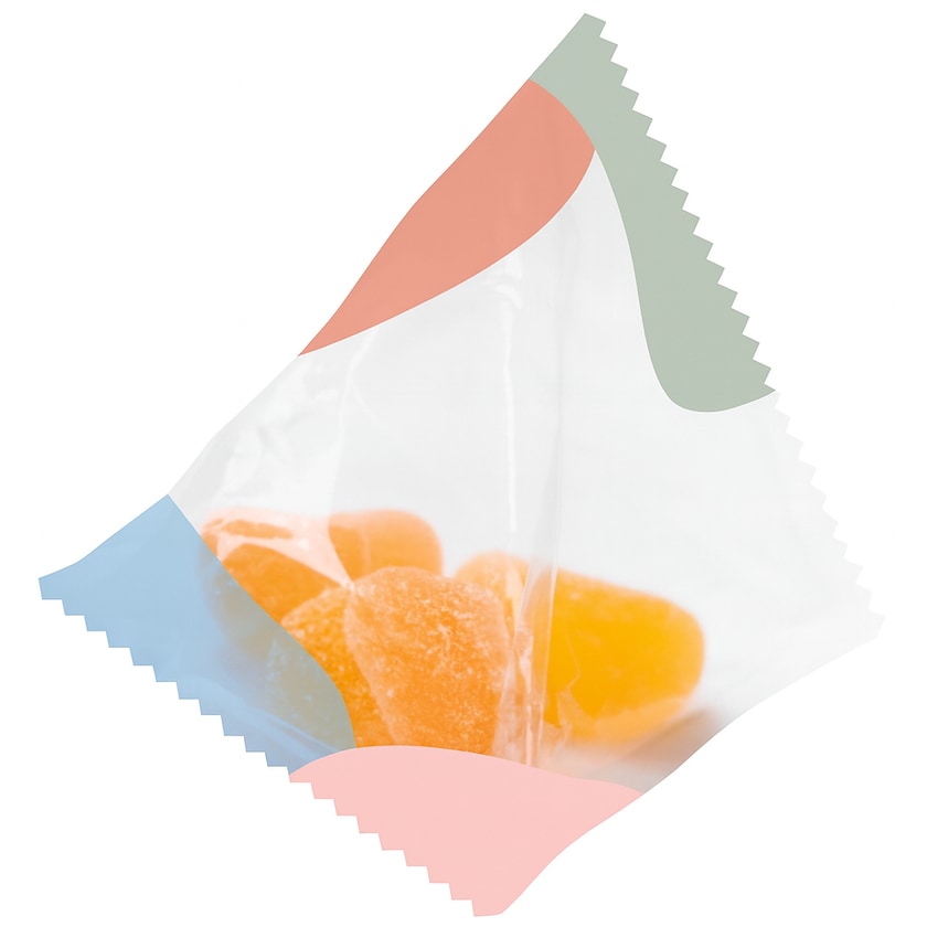 Pyramide med gelégodteri. Pyramiden inneholder en herlig blanding av smakene appelsin og sitron. Hele kuben trykkes etter egne ønsker. Du velger selv om du vil at pyramiden skal lages i transparent eller ensfarget materiale.