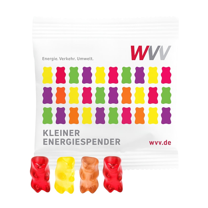 10 grams pose med gelébjørner som kan bestilles fra kun 1000 stk. Gelébjørnene har lekker fruktsmak. Posen trykkes med digitaltrykk helt etter eget ønske. Innpakkingen er laget i hvit plast. Perfekt til messen, eventet eller utstillingen!