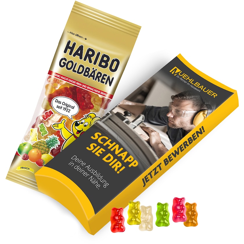 Pappinnpakking med 75 grams godteripose fra populære Haribo. Hele pappinnpakkingen trykkes etter dine ønsker.