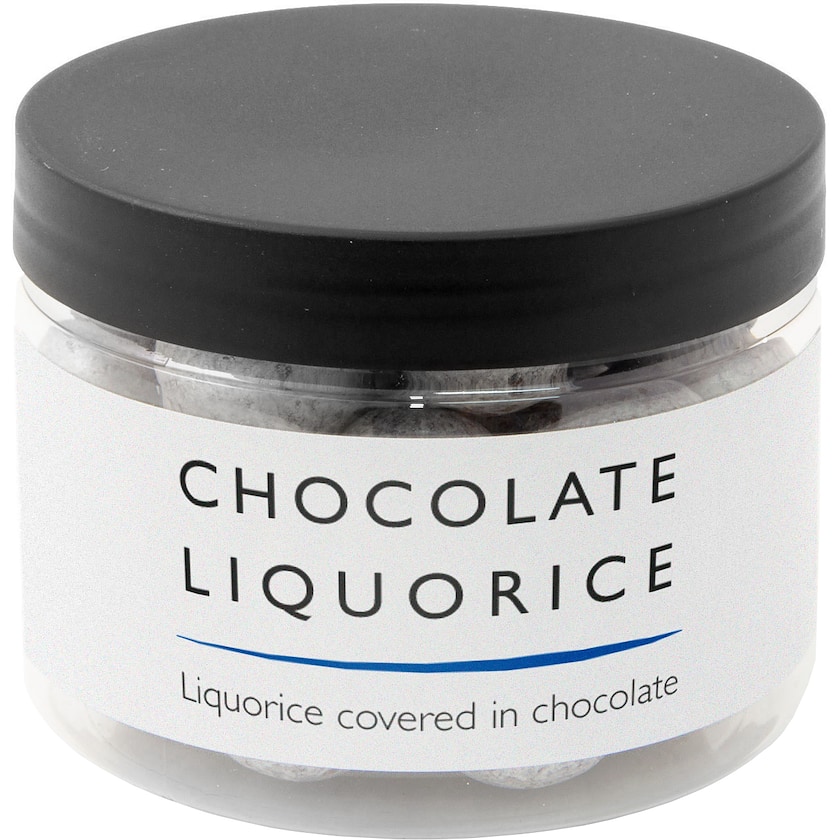 Plastboks fylt med 100 gram luksuriøse lakriskuler. Velg mellom lakriskuler sjokoladedrapering i bronse-, sølv- eller gullfarge. Etiketten designer du helt selv. En luksuriøs gave til de beste kundene.