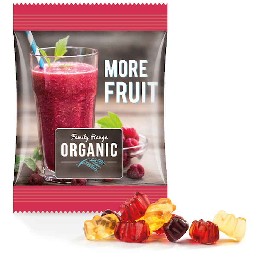 Luksuriøse gelébjørner som inneholder hele 30% ekte frukt. Gelébjørnene er laget av den tyske kvalitetsprodusenten Trolli og kommer i seks forskjellige farger. Hele innpakkingen trykkes etter dine ønsker.