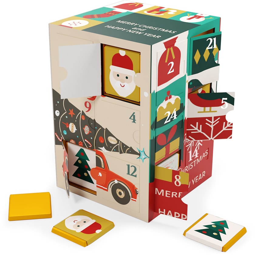 Kubisk adventskalender fylt med luksuriøs belgisk sjokolade. Adventskalenderen har 24 sjokoladebiter fordelt på fire sider. Både adventskalenderen og papiret på hver eneste sjokoladebit, trykkes etter dine egne ønsker. Velg mellom melkesjokolade 32% og mørk sjokolade 62%. Foliefargen kan enten være gull- eller sølvfarget.