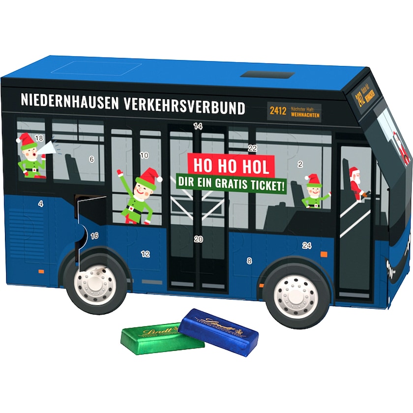 Unik adventskalender fylles med sjokolade fra Lindt. Sjokladebitene er av typen melkesjokolade og har til forskjellige foliefarger. Favoritten til alle bussjåfører.