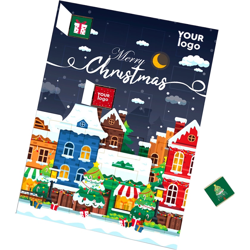 Adventskalender med sjokoladekvadrater med eget trykk. Både selve adventskalenderen og sjokoladekvadratene trykkes etter dine egne ønsker. Derfor har du mulighet til å lage en helt unik adventskalender fylt med utsøkt sjokolade. Sjokoladekvadratene kan enten kjøpes med melkesjokolade eller mørk sjokolade.
