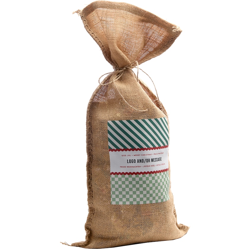 Stor julesekk fylt med 3 kg julegodteri av valgfri sort. Julegodteriet finnes i smakene italiensk pralinermiks, sjokoladedrapert karamellblanding, juleskum og blandet julekaramell. Jutesekken påføres ditt eget trykk. En verdsatt julegave til de ansatte.