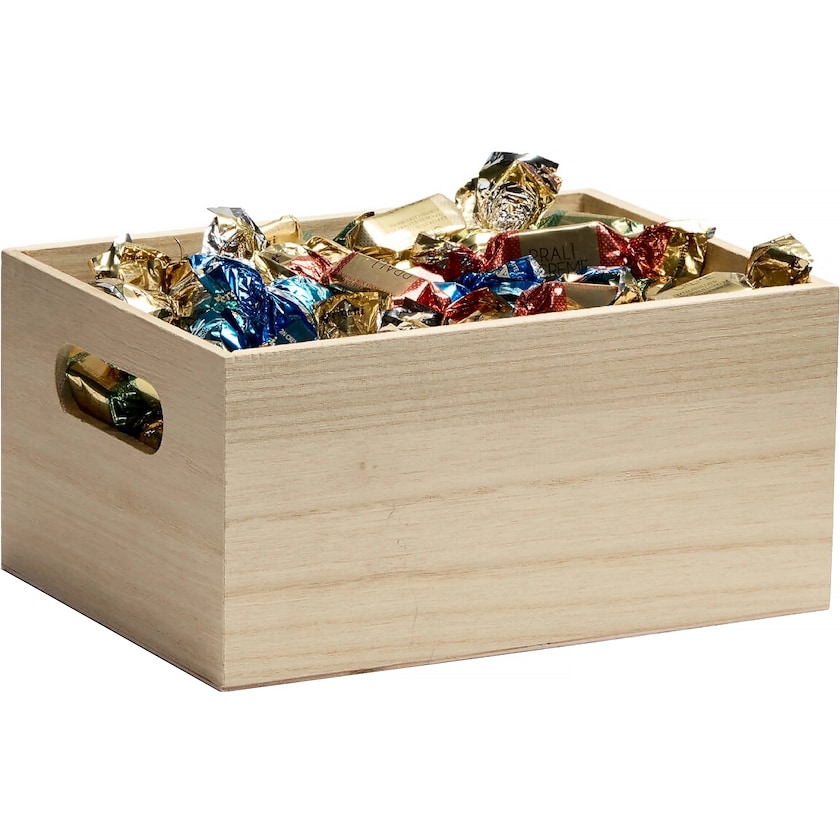 Liten trekasse fylt med 1 kg luksuriøs, italiensk pralinmiks. Et julekort med egen julehilsen er inkludert i prisen.