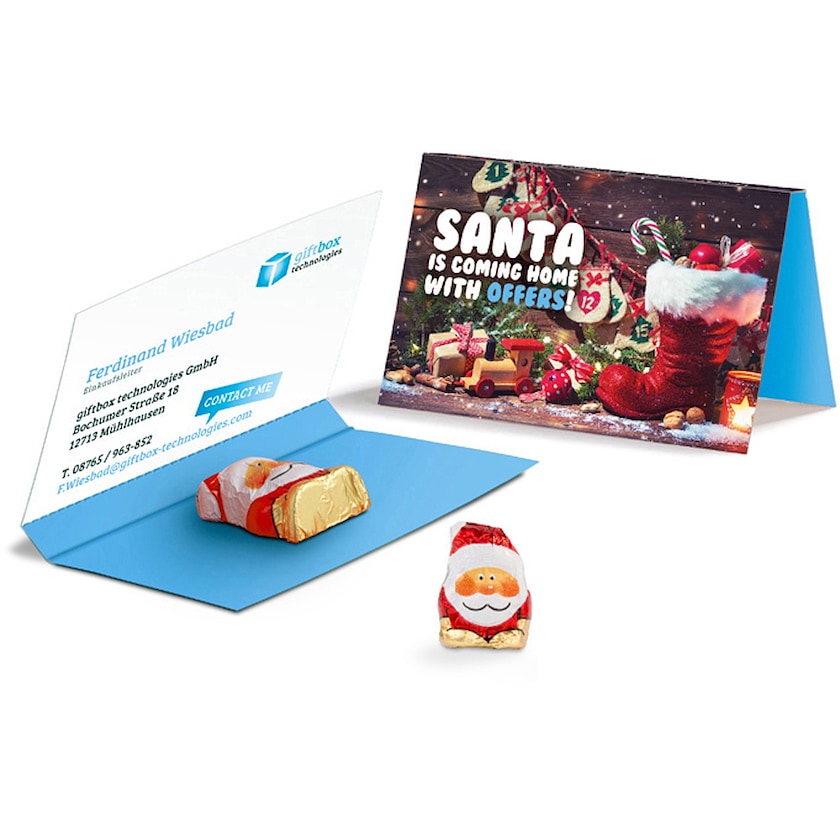 Sjokoladenisse festet på et julekort som trykkes etter ønske. Last ned trykkmalen og skap en virkelig personlig julehilsen.
