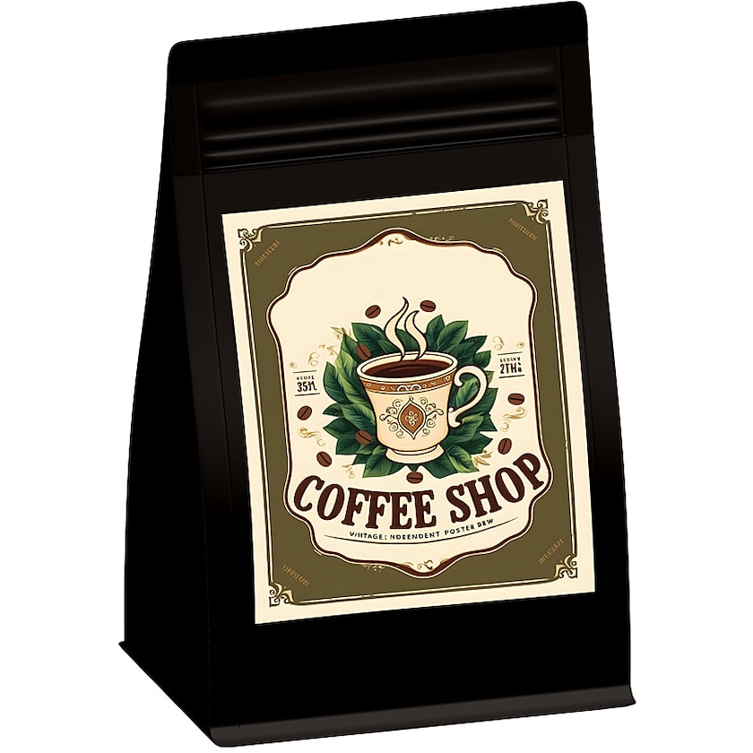Pose med 70 gram arabica-kaffe av høyeste kvalitet. Du velger selv mellom malt kaffe og hele, ristede kaffebønner samt om du ønsker svart, hvit eller naturdfarget pose. Trykket gjøres på et klistremerke som festes på forsiden av posen. På baksiden er det en etikett med innholdsfortegnelse.