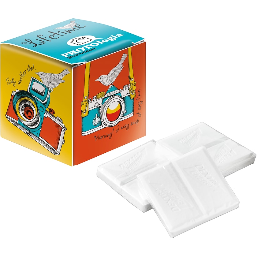 Pappeske fylt med fem Dextro Energy -tabletter. Hele esken trykkes med ditt trykk. Last ned trykkmalen og lad din egen unike forpakning.