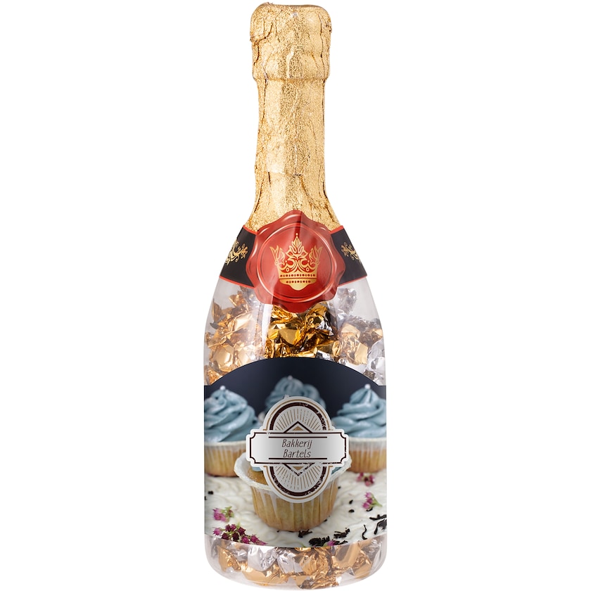 Boble noen? Kul champagneflaske fylt med drops. Inneholder 350 gram karameller. Flasken er utstyrt med en etikett som trykkes etter dine egne ønsker. Det trykkes ikke på dropsene.