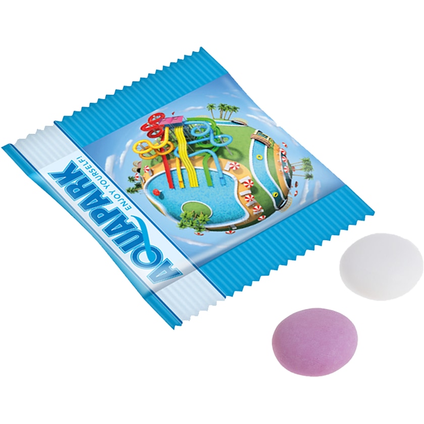 To Mentos i en flowpack med ditt eget trykk. Velg mellom Mentos i smakene mint og fruktmiks. Hele flowpacken trykkes etter dine egne ønsker.