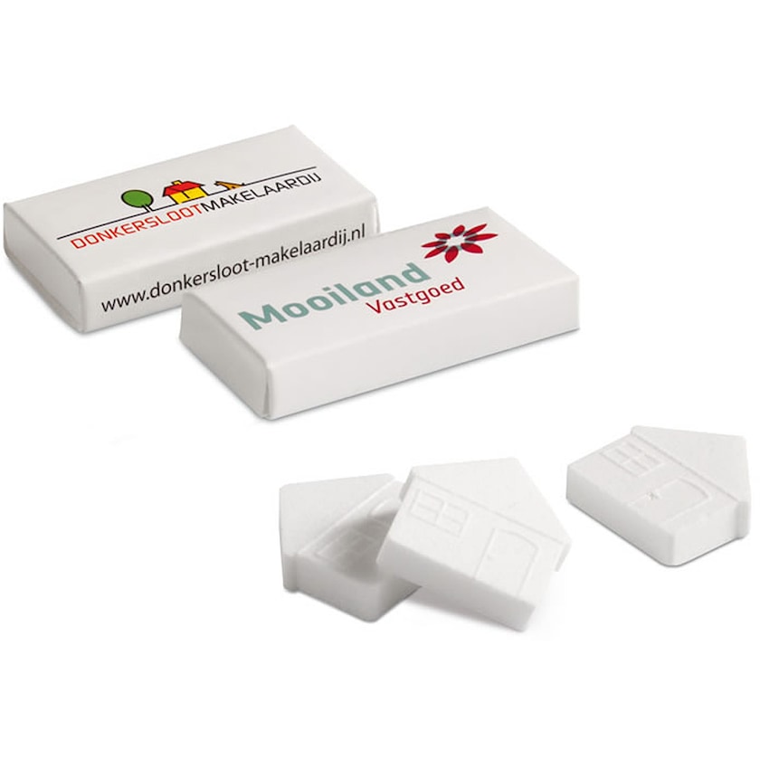 Liten miniboks med to oppfriskende mintpastiller formet som et hus. Perfekt for alle som jobber med eiendommer.