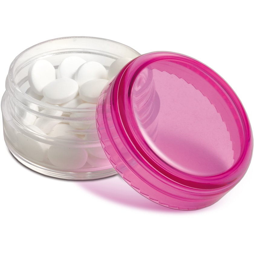 Boks med ca 12 gram sukkerfrie mintpastiller med peppermyntesmak. En unik godteboks som gir bra reklame til en liten kostnad