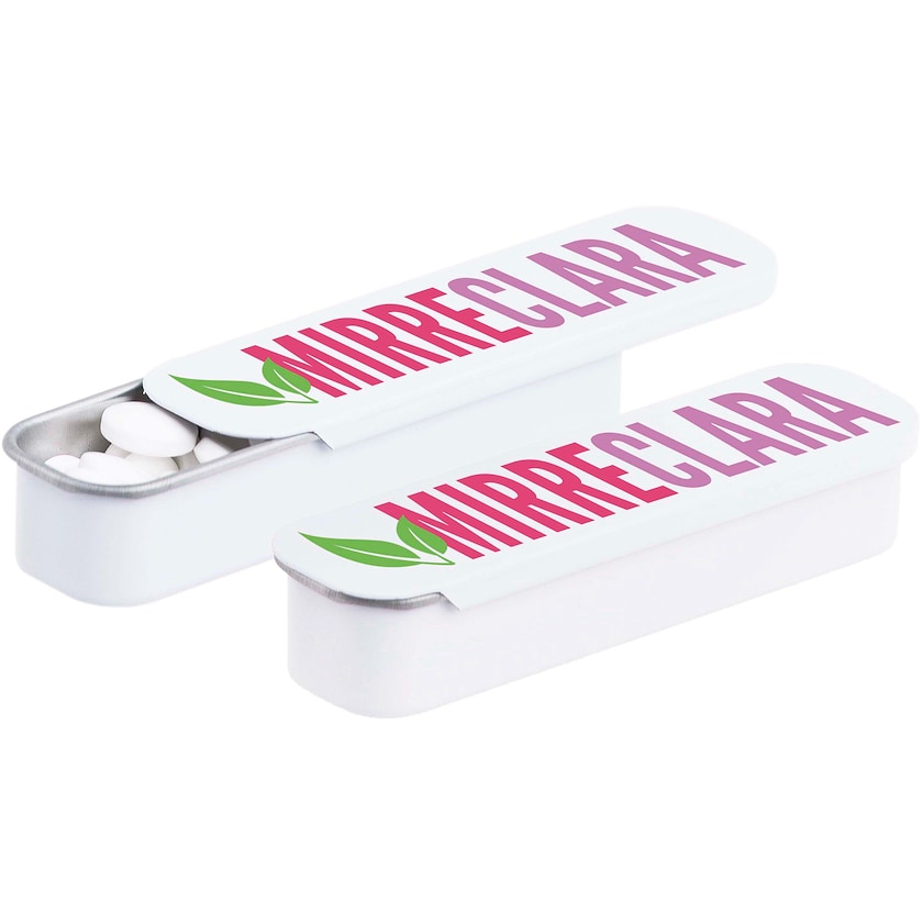 Metallboks med 11 gram oppfriskende mintpastiller. Velg mellom sukkerfri og vanlig mint. Trykket skjer på boksens lokk.