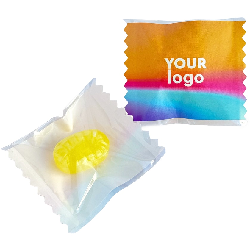 Sukkerfrie drops med eget trykk. Hvert drops er pakket i en flow-pack med ditt eget trykk på oversiden. Velg mellom smaksvariantene miks og mentol.