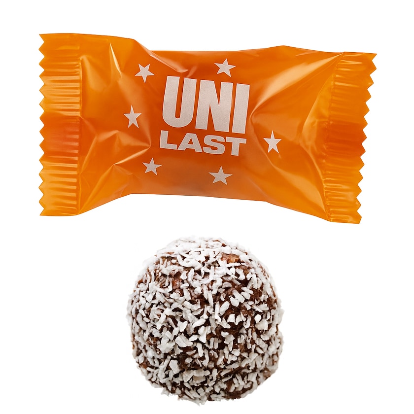 Stor sjokoladebolle i innpakking med eget trykk. Sjokoladebollen har lekker mokkasmak og et overdrag av kakao og kokos. Hele innpakkingen trykkes etter dine ønsker. Et perfekt mellommåltid.