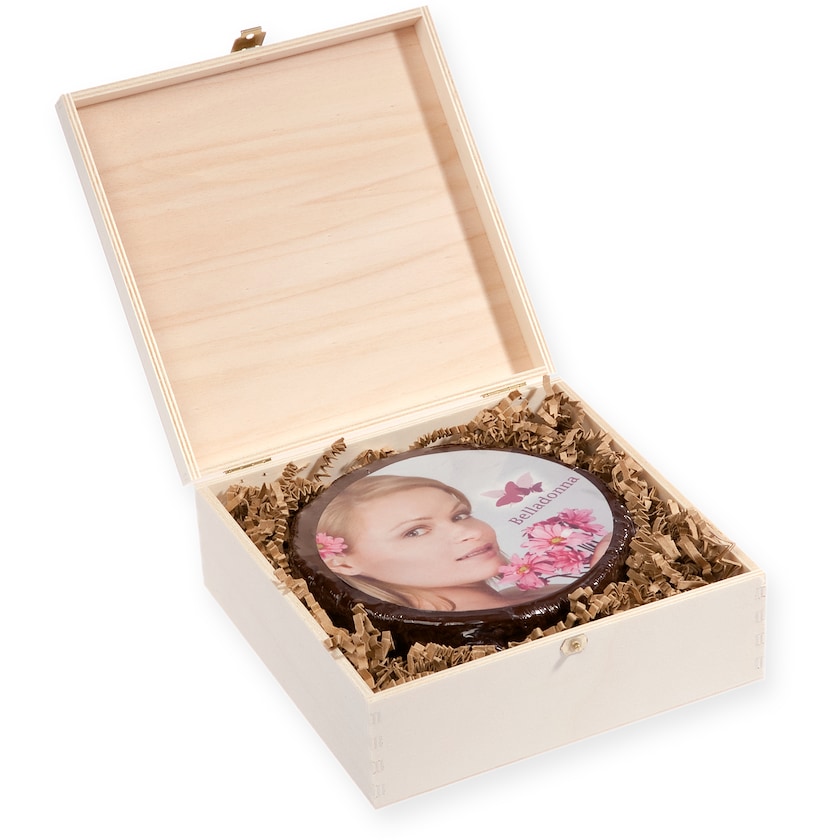 Sjokoladekake med trykk over hele oversiden i en stilig treeske. Trykkingen gjøres med næringsmiddelgodkjente farger og i full fotorealisme. Kaken leveres i en stilig treeske.