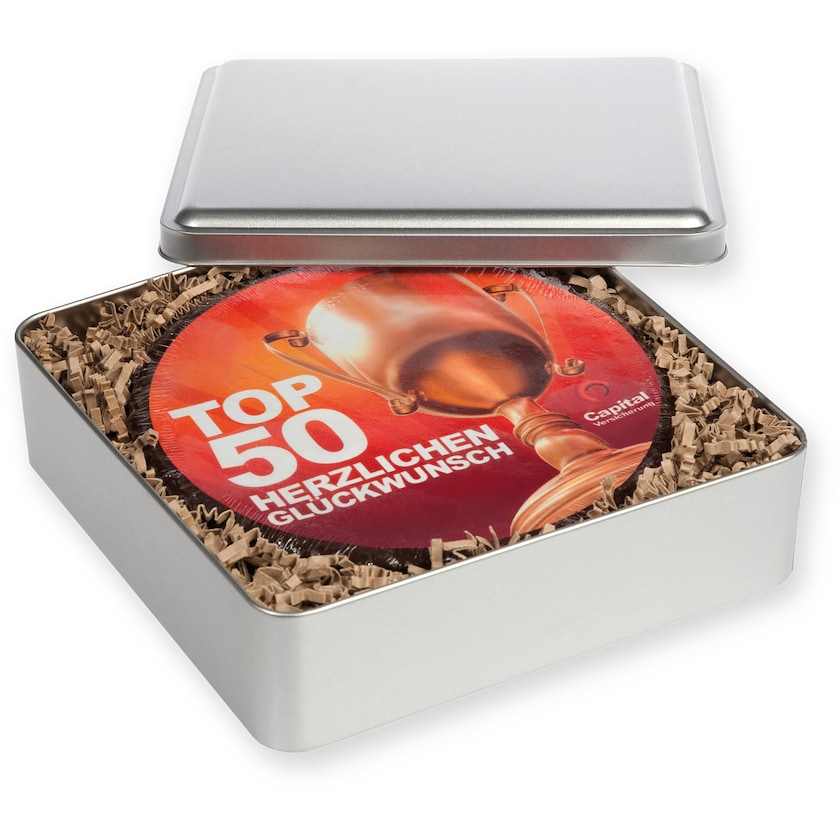 Stor sjokoladekake med trykk på oversiden. Hele oversiden på kaken trykkes med full fotorealisme helt etter egne ønsker. Leveres i en eksklusiv metallboks.