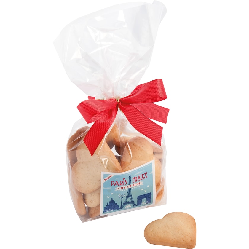 Hjerteformede smørkjeks i en pose med bånd. På posens front plasseres en digitaltrykket etikett. Velg mellom bånd i fargene brun, blått og rødt.