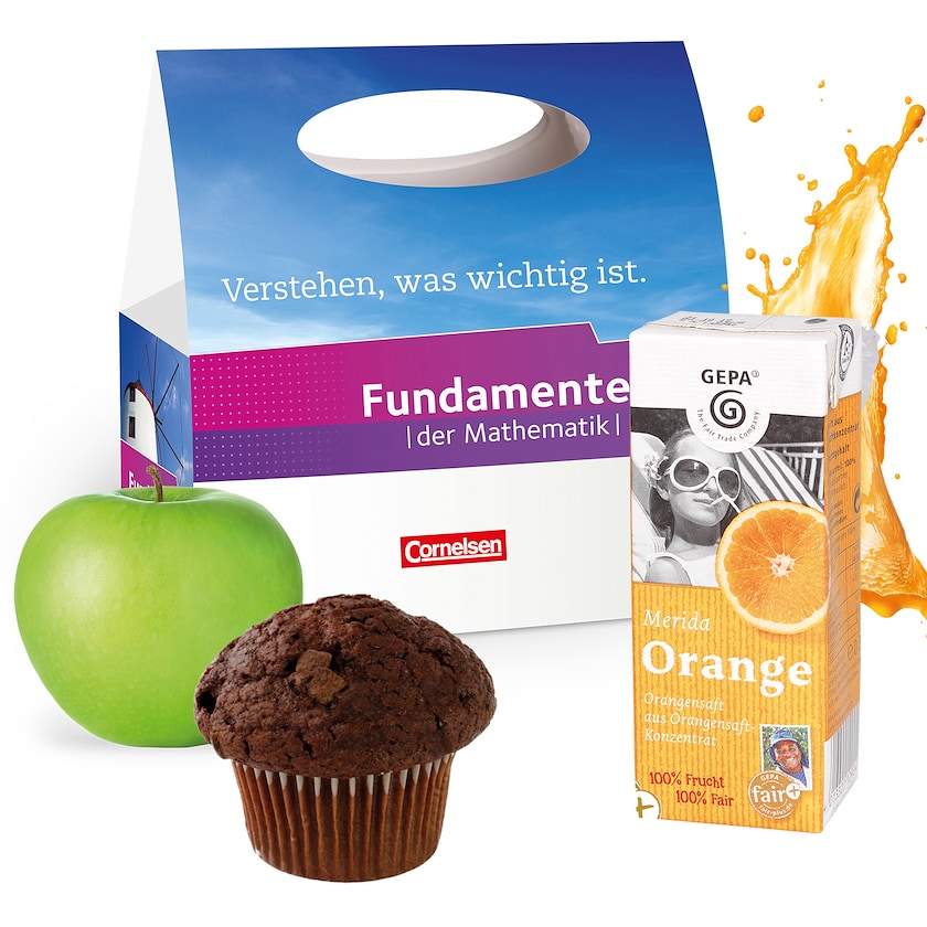Digitaltrykket pappboks med muffin, eple og appelsinjuice. Muffinsen kan du få i smakene sjokolade eller sjokoladebiter. Eplene er enten røde eller grønne, etter sesong og tilgang. Juiceinnpakkingen inneholder 20 cl juice. Et herlig mellommåltid!