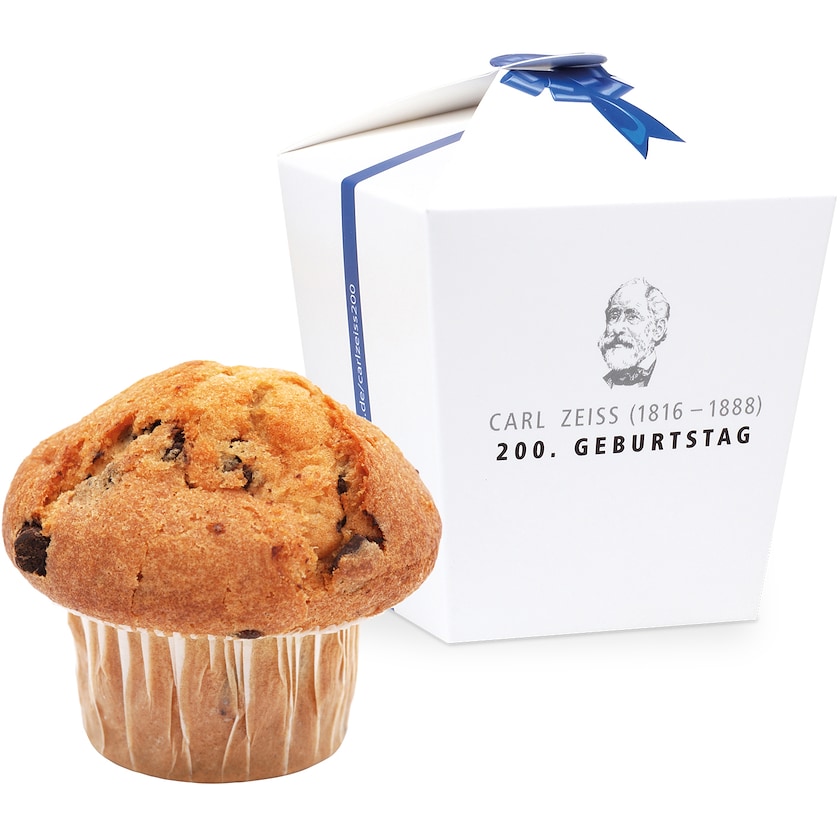 Stor muffin i digitaltrykket pappboks. Velg mellom smakene sjokolade og sjokoladebiter. Hele pappboksen trykkes etter dine ønsker. Herlig, velsmakende muffins!