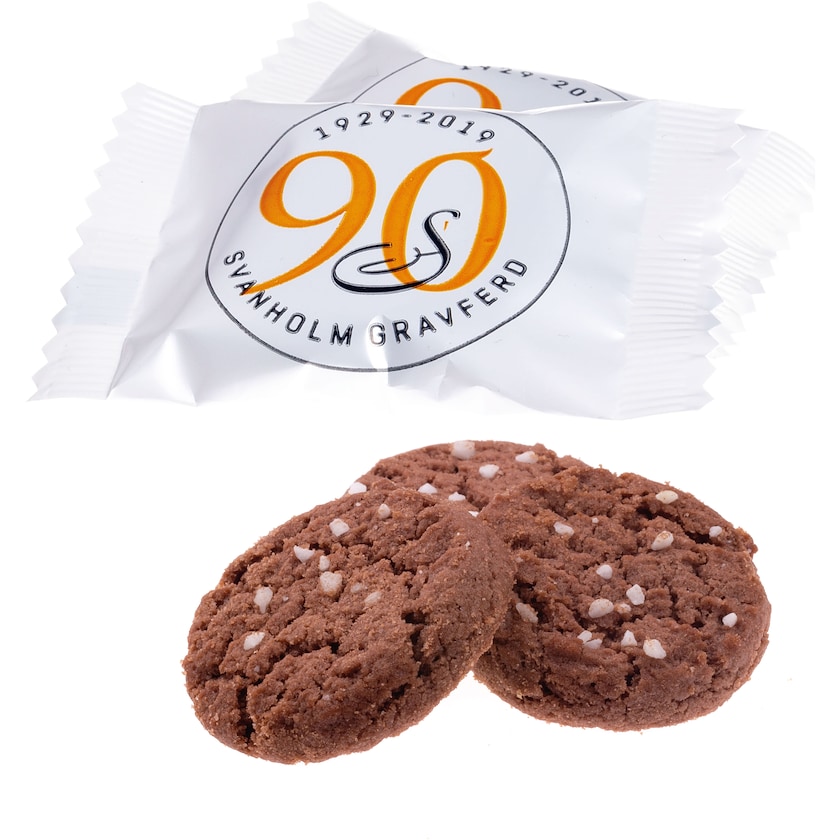En kjeks fra Nyåkers i flowpack med trykk. Velg mellom smakene fløtekaramell eller sjokolade. Et perfekt mellommåltid.