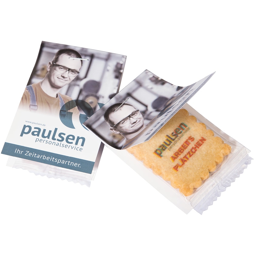 Smørkjeks med digitaltrykt kort. Smørkjeksen har en herlig vaniljesmak. Både kortet og oversiden av kjeksen påføres digitaltrykk. Trykket på kjeksen gjøres med karamellfarge. En kul og smakfull måte å gjøre god reklame!