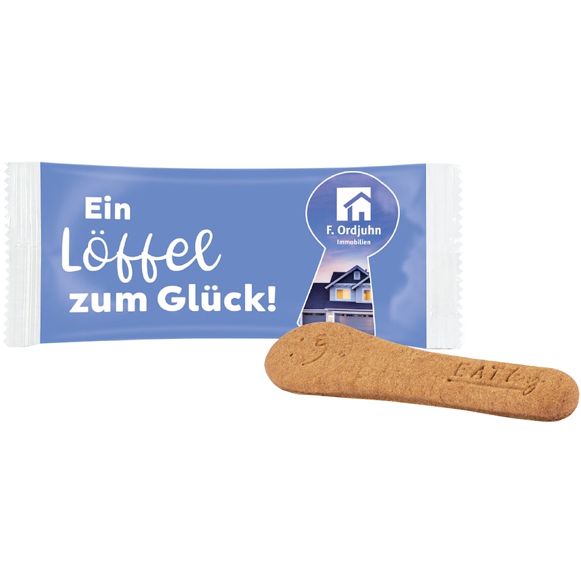 Kjeks formet som en skje i flowpack med eget trykk. Kjeksen er bakt med durumhvete og er fantastisk god. En trivelig kjeks til kaffepausen, som garantert kommer til å oppmuntre til glade minner.